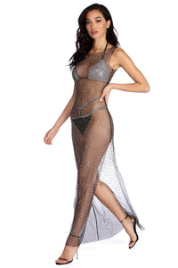 Yes girl, you'll bring the heat in this black mesh cover up! It features a sleeveless bodice, tank-like shoulder straps, a high round neckline, a high front slit, and a long flowy length. The cover up is composed of a sheer mesh fabric adorned with multi-faceted rhinestones all over.