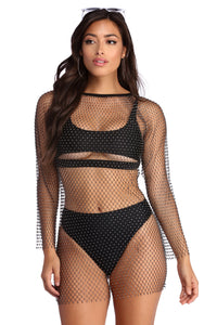 Get all caught up in style with this sexy fishnet cover up! It features long sleeves, a high round neckline, and a short, fitted look. The cover up is composed of a black sheer fishnet fabric adorned with rhinestones for an added glam factor. Swim suit not included.Model is 5'7" with a 34" bust, 24" waist and 36" hips. She is wearing a size small.