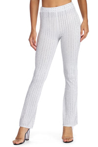 Shine bright and steal the scene in these rhinestone pants! They feature an elastic high rise waist paired with long fitted pant legs with a slightly flared hem. The pants are composed of a slightly sheer shimmering knit fabric that offers plenty of stretch and a form-fitting style and are adorned with multifaceted rhinestones.Sizes run small. Fit model recommends purchasing one size up.
