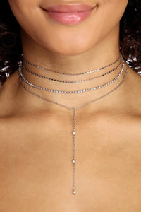 Get a subtle layered look with this rhinestone and chain lariat set! This necklace multi-pack includes four dainty chain necklaces with a short lariat design and dainty rhinestone. Pieces have a lobster clasp closure. Set includes four necklaces.