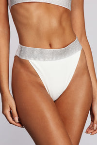 Girl, you'll be drippin' in rhinestones with these fab white swim bottoms! They feature a high rise waist band adorned with mini rhinestones and a partial coverage bottom. Complete your look with the matching swim top!ALL RETURNS ACCEPTED ONLY WHEN TAGS AND HYGIENIC PROTECTION ARE IN TACT.