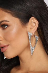 Bold and geometric, these oversize earrings will seriously up your bling game. Triangular-shaped earrings are rhinestone-encrusted on one side and solid silver-tone metal on the other. They feature an open circular cutout and pierced post backs.