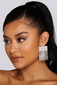 Have a major glam moment in these diva-worthy statement earrings! They feature a rhinestone adorned rectangular post with cascading rhinestone fringe. Includes post back closures.