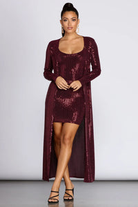 Drape yourself with sparkling sequins as you shine like the diva you are! The duster features a drape open front, fitted long sleeves and near-floor length. Duster is composed of an unlined mesh fabric adorned with dazzling sequins throughout. Be sure to pick up the matching dress to complete your look!