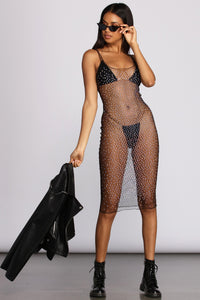Sparks will ignite when you style up this sultry heat stone embellished tunic! It features a sleeveless bodice, a scoop neckline, thin shoulder straps, and a form hugging fit that hits around the knees. The sheer tunic is composed of a stretchy mesh fabric embroidered with gorg dazzling heat stones.Model is 5'9" with a 32" bust, a 24.5" waist, and 35" hips. She is wearing a size small.