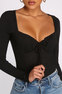 Sweet On You Knit Bodysuit Sweet On You Knit BodysuitEveryone will be crushin' on you in this sweet rib knit bodysuit! It features long fitted sleeves, a flattering sweetheart neckline with a ruched bust, faux front tie detail, and a thong bottom with dual snap-button closures. Style with mom jeans and cute mules, you'll have a perfect 'fit babe! Fit & Features - Long sleeves