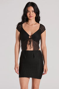Set For Good Cap Sleeve Slit Texture Crop Top Set For Good Cap Sleeve Slit Texture Crop TopYou'll be set for good in this stylish texture crop top all season! Featuring adorable cap sleeves, a V-neckline, and an adjustable bust drawstring atop a flirty slit along the cropped hem. Complete the look with the matching bottoms. Shop Matching Bottoms: Set For Good High Rise Texture Mini Skirt Fit & Features - Texture sheer fabric, bust lining, minimal stretch