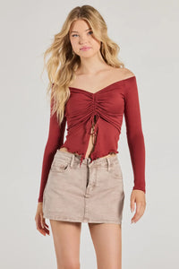 Adorable Flirt Off-The-Shoulder Knit Top Adorable Flirt Off-The-Shoulder Knit TopThis adorable knit top features an off-the-shoulder neckline with a sweetheart bust, a ruched tie-front design with a flirty front slit, and a mid-length hem with the cutest lettuce-edge trim. Style with jeans and sneakers for every day. Fit & Features - Knit fabric with plenty of stretch