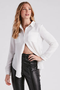Chic Bliss Long Sleeve Button Up Top Chic Bliss Long Sleeve Button Up TopThis long sleeve top will give your closet a touch of chic! It features long sleeves with button cuffs, a collar neckline, button-up front closures, front pockets, and a relaxed scoop hem. The airy textured woven fabric has no stretch. Style with skinny pants and heels to complete the look! Fit & Features - Long sleeves, button cuffs