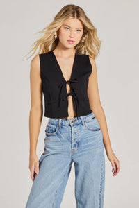 Adorable Entrance Tie-Front Ponte Vest Adorable Entrance Tie-Front Ponte VestMake your entrance something everyone will notice in this sleeveless ponte vest! This adorable vest features dual tie-front closures and a split center design, giving you a versatile, cropped piece that can be dressed up or down. Complete the look in denim jeans and mules. Fit & Features - Ponte woven fabric, sewn-in knit lining, slight stretch