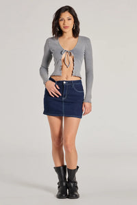 Major Crush Ribbed Knit Tie-Front Cardigan Major Crush Ribbed Knit Tie-Front CardiganYou'll crush hard for this rib knit tie-front cardigan with fitted long sleeves and a flirty open front design that flaunts your figure. Pair with a mini skirt. Fit & Features - Ribbed knit fabric, plenty of stretch