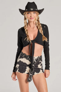 Cowgirl Outlaw Tie-Front Crop Top Cowgirl Outlaw Tie-Front Crop TopShow up and strut in style at your Halloween party as a cowgirl outlaw in this tie-front crop top! Designed with crepe fabric, it features a collar with metal trim accents, a plunging V-neckline with an adorable tie-front design, long fitted sleeves, and an ultra-cropped hem with a form-hugging fit. Complete your costume with the cow print hot shorts, concho belt, cowboy hat, and sleek western boots! Fit & Features - Crepe fabric with moderate stretch