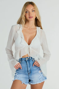 Finding Inspiration Ruffled Tie Front Chiffon Top Finding Inspiration Ruffled Tie Front Chiffon TopLook further for outfit inspiration than this chiffon top perfect for adding a high fashion look! With its charming long sleeves with flared cuffs and ruffled trim V-neckline, this top exudes elegance and style. The tie-front detail adds a playful touch, while the sheer chiffon fabric keeps you feeling light and airy. Complete the look with a bralette and jeans! Fit & Features - Sheer chiffon woven fabric, no stretch