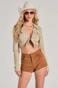 Adventurous Girlie Tie-Front Crop Top Adventurous Girlie Tie-Front Crop TopServe adventurous girlie vibes this Halloween in this woven crop top! It features a collared V-neckline, a tie-front design, long sleeves with cuffed hems, and buttoned chest pockets. Complete your costume with the faux suede shorts, cowgirl hat, aviator sunglasses, and boots! Fit & Features - Brushed woven fabric, no stretch