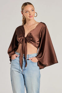 Silky Satin Tie Front Crop Top Silky Satin Tie Front Crop TopThis silky satin crop top features trendy kimono half-length sleeves and a tie-front design making it perfect for layering or styling on its own. Fit & Features - Satin woven fabric, no stretch