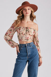 Flawless Floral Mesh Tie Crop Top Flawless Floral Mesh Tie Crop TopKeep it fresh looking flawless in this floral mesh crop top to pair with your favorite bottoms! It features an off-the-shoulder neckline, sheer peasant sleeves, a tie-front closure with a keyhole accent, and a ruched bust and fitted hem. Style with new skinny jeans to complete the look! Fit & Features - Off-the-shoulder neckline