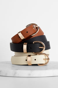 Cinch your look with neutral hues to easily complement your looks, whether you're dressing down or up! This multi pack includes three sleek narrow belts that each feature a gold metal buckle with metal prongs to keep belt in place and are composed of a faux leather material. Pack includes neutral hues such as tan, beige and black that provide plenty of styling options!