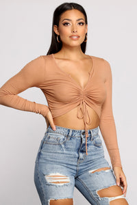 Get drawn in to this cute crop top! The top features a V-neckline with notched detail, a center drawstring, and a cropped hem. The top is composed of a ribbed knit fabric that offers a form hugging fit with a moderate stretch. Complete look with biker shorts.