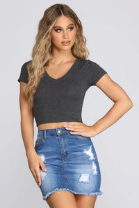 Keep it basic in a top that is so cute to go with all your favorite skirts and leggings. The top features a plunging wrap V-neckline, long sleeves, a ruched side seam, and a cropped hem. The top is composed of a soft to the touch cotton knit fabric that offers a relaxed fit with a moderate stretch.