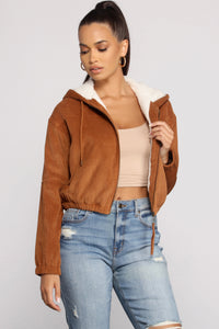 Keep it cute and cozy in a jacket that is so on trend this season! The jacket features a drawstring hoodie, side pockets, a corduroy composition, and a cozy sherpa knit lining. Complete your outfit with high waist skinny jeans and booties.