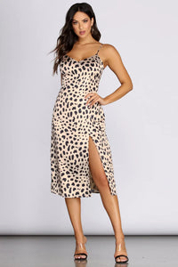 Preen, play, and prowl in this body-skimming leopard print midi dress. Dress features adjustable spaghetti straps, back zip, and a thigh-high slit. Dress is lined and made from a satin-like fabric with little to no stretch.