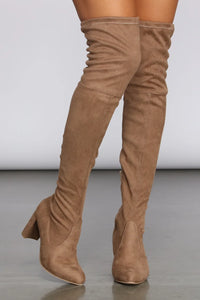 Make a sleek impression with over the knee boots that slay! The boots feature an over the knee fit, a pointed toe, and a sleek stiletto heel. The boots are composed of a faux suede material. Complete your look with a ribbed mini dress.