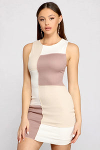 Channel a retro moment with a mini dress that makes a stylish statement. The dress features a sleeveless crew neckline, a colorblock design accented with exposed seams, and a mini-length silhouette. The dress is composed of a ribbed knit fabric that offers a form-hugging fit with a moderate stretch. Complete look with mules.