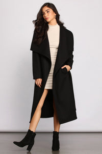 Get a day chic vibe by layering on this belted coat! It features a trendy drape front and is composed of faux wool fabric. Wear this over your fave knit sweater and pair with some sleek block heeled booties.