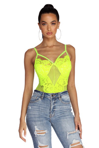 You can be found in this lace scallop bodysuit all season long! It features a sleeveless v-neckline, adjustable spaghetti straps that cross in the back, an open back, and a thong-cut bottom with dual snap-button closures. Complete the look in a chic crop blazer.