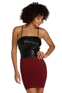 You'll slay your outfit in this black sequin bodysuit! It features a square neckline, an open back with lace up straps, and a slim-fitting bodice adorned with black sequins. Bodysuit has a cheeky bottom with snap button closures.