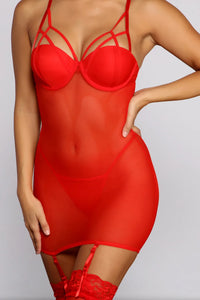 Mesmerize in this sultry mesh chemise set for a romantic night in. This fitted mesh lingerie dress and matching panty set sets the tone for the most romantic night ever! The set also includes thigh-high stockings to really raise the heat. Complete look with false lashes to nail that sultry look.