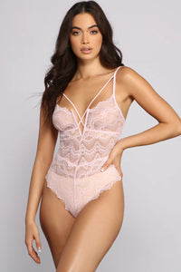 Vamp up the romance with a lace teddy that brings the sultriness. The teddy features a sleeveless, a plunging V-neckline, a caged design, an unlined lace body throughout, and a lower back keyhole with a cheeky fit. Complete look with a satin duster for a gorgeous outfit.