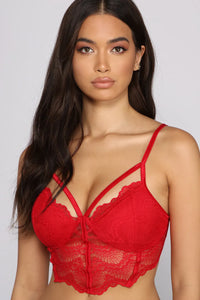 Strike a love connection with this sultry lace bra! The lace bra features a caged design, adjustable spaghetti straps, molded cups, piping trim, and a longline lace hem. Complete look with a mesh robe for a date night look.