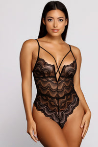 This dainty lace caged teddy is perfect for a night in! It features adjustable spaghetti straps and a V wired front with a caged design. Wear this sheer lace teddy with a long flowy duster for a gorgeous stay at home look.