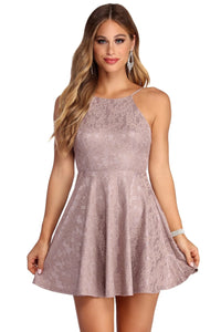 Fall in love with lace with this pretty mauve skater dress! It features a sleeveless bodice, a halter neckline that leads to a partially open back with a zipper and hook and eye closure, a high waist seam, and a flowy skater skirt. The dress is composed of a lined lace fabric with minimal stretch.Model is 5'6.5" with a 32" bust, 23.5" waist and 35" hips. She is wearing a size small.