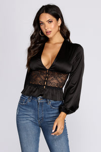 Chic and sleek, this satin lace blouse is perfect for you. It features long sleeves with elastic banded cuffs, a V neckline, center button down detailing, a sheer lace inset under the bust, and a mid-length ruffle hem. The top is composed of a lighweight satin-like fabric with no stretch.Style Number/Barcode: 06003-0367