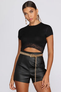 Keep it cute, cool, and cropped in this must-have ribbed tee. Cut to fit close to the body, shirt features a crew neck, short sleeves, and a high-low hem with lace trim at front. Top is made from a super-soft woven knit with moderate stretch.