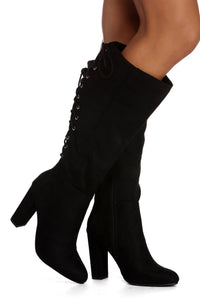 Lace up in these beauties for a glam look! These black boots feature an under the knee fit, a lace up back with silver hued metal grommets, an inner zipper closure, an almond toe and a sturdy block heel. Boots are composed of a faux suede material.