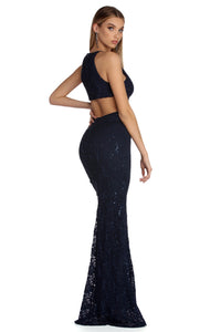 Special OccasionKeep your look timelessly flawless in our alluring Keltie navy blue dress! She features a high round neckline with racer bust, padded cups and a eye catching open lower back accent. Her slim fit bodice leads to an elegant floor length silhouette that showcases curves from any angle! She is composed of a lined floral lace fabric adorned with sparkling sequins to dazzle through the night! Dress offers a form hugging fit with a moderate stretch and includes a back zipper closure.
