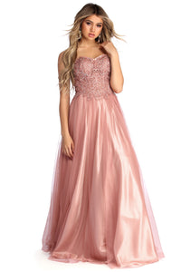 Special OccasionBeauty takes the form of our mauve Rosalie ball gown! Make your royal arrival with a corset bodice complete with a sweetheart neckline, a silicone no slip strip, boning for added structure, a padded bust, a lace up back with satin ribbon, and an intricately beaded applique with a sheer mesh lining. Bodice leads to a gorgeous A-line skirt with a pink sheen and tulle overlay. Dress offers a relaxed fit with minimal stretch.
