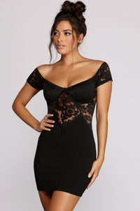 Fall head over heels for this sultry lace LBD! It features an off the shoulder sweetheart neckline, a lined and padded bust, a square back with a zipper and hook and eye closure, sheer lace insets at the waist, and a short crepe skirt that hits mid-thigh. The mini dress offers plenty of curve hugging stretch.Model is 5'7" with a 34" bust, 24" waist and 36" hips. She is wearing a size small.