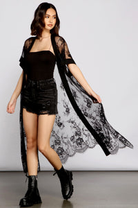 Keep it pretty in lace with a duster that is perf to layer over your gorge outfits! The duster features a draped open front, kimono sleeves, and a crochet lace pattern. Complete look with a crop top and high waist shorts.