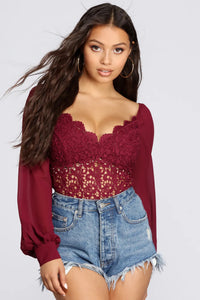Show off your charming style with this sheer lace corset top! This stunning top features sheer lace peasant long sleeves, a wired V-neckline and underwire bust for a gorgeous silhouette, flexible boning for a structured fit, and a sheer lace bodice and cropped hem. Complete the look in flare pants for a chic dinner date outfit!