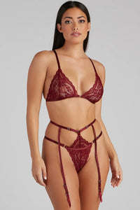They'll definitely fall for you in this sultry-chic bra and panty set! The bra features triangle-shaped cups with unlined lace fabric and adjustable spaghetti straps for a customized fit. The matching sheer lace panty features a high-cut design with a thong bottom and sexy adjustable garter straps. Style this set with a lightweight flowy robe.