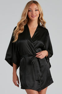 Flaunt your sultry side in this satin robe for a night spent in! It features flowy, half-sleeves, and an open-front design with a belted waist. Complete the look in a lacey lingerie set.