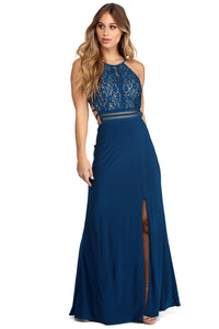 Special OccasionCharm in lace as you wow in our Mackenzie blue dress! She features an all over blue hue, a high round neckline with racer bust and narrow straps that lead to a caged back design. Her lined bodice features a gorgeous lace pattern adorned with gleaming sequins and leads to an unlined mesh waist accent. Her floor length silhouette is accented with a high side slit to show off your glowing gams! Dress is composed of combination mesh and chiffon fabric that offers a relaxed fit with minimal stretch. Includes a hidden back zipper closure.