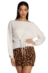 This lovely lace up ivory sweater is just what you need for the cooler months! It features a wide boat neckline, long sleeves, a lattice lace up detail at the waist, and a ribbed hem. The sweater is composed of a soft knit fabric with moderate stretch and a relaxed fit.