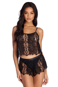 Let your intentions be known with this pretty lace set! It features an unlined lace cami with a scoop neckline, narrow adjustable straps and a scalloped lace hem. The matching unlined shorts feature a high rise waist and a cheeky bottom. Both pieces are sheer and unlined. Undergarments not included.Model is 5'8.5" with a 32" bust, 24" waist and 35" hips. She is wearing a size small.