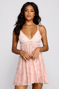 Live and love in lace as you radiate confidence in this must have dress! It features a natural hue, a sleeveless bodice, a V neckline with adjustable narrow straps and a mini length silhouette with a scalloped lace trim. Dress is composed of a lined scalloped lace fabric that offers a form hugging fit with a moderate stretch.