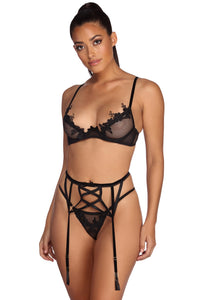 Make it a little more fun tonight in this seductive black lingerie set. It features a bra with underwire, floral applique mesh and adjustable straps, a matching G-string, and a garter with a caged design.Model is 5'7" with a 34" bust, 24" waist and 36" hips. She is wearing a size small.
